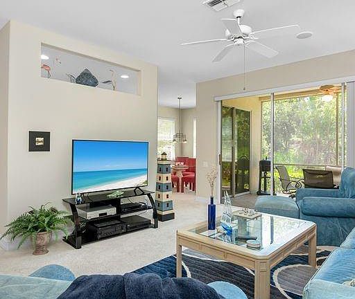 Unique opportunity to own a rarely available first-floor end unit in the sought-after Tarpon Cove community, offering ample open space for unparalleled privacy. The master bedroom boasts a spacious walk-in closet and an ensuite master bath featuring double sinks and a glass-enclosed shower. Two additional bedrooms are complemented by a well-appointed guest bathroom. Accessible from both the master bedroom and living room, the lanai opens up to a tranquil preserve. The bright and airy white kitchen is accompanied by a generously sized breakfast room flooded with natural light. This property is being sold turnkey, including all furnishings and accessories right down to the knives and forks. Ready to move-in on day one!