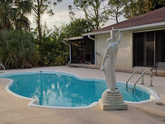 Unique home 3 bedroom 2 bath home on 1.1 acre of land in the very sought after Indian River Estates subdivision. Spacious split floor plan. The family room has pocket sliders opening to the pool and patio area. The kitchen features tiled counter tops, breakfast bar, center island, and large pantry. Large sized master suite with a Jacuzzi tub and a separate shower. Double sinks and two walk in closets. Front entry porch is screened and additional screened porch on rear of home. This property also has a 34X50 foot garage/warehouse with an inside loft area. It has large roll up doors perfect for RV or large boat storage, great for hobbyist, or car collectors. There is a separate 2 story shed that is in need of repair. Property is fenced but needs TLC. SELLER MOTIVATED TO SELL. SOLD AS IS.