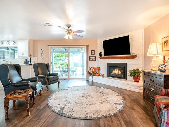 Inside, the open floorplan flows effortlessly, creating an inviting atmosphere for everyday living and entertaining. The updated kitchen boasts quartz countertops, a double oven, a wine fridge, and ample storage. The living and dining spaces extend to a large patio, offering seamless indoor-outdoor living ideal for gatherings.