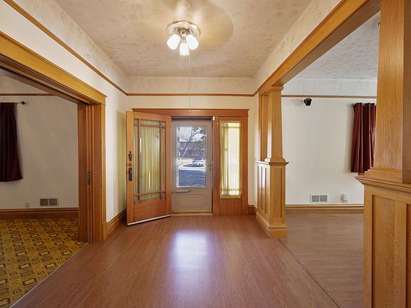 Cozy Craftsman style house with original woodwork , pocket doors, stained glass windows, updated bathrooms and updated kitchen. Lots of living space with 3 bedrooms, 2 baths and 2 living areas with fireplace in main living area. Basement and extra outdoor storage space. Over 1600 sq ft of living space. 1200 sq ft metal building with 2 other storage buildings on this property! Sprinkler system in great yard on corner lot!