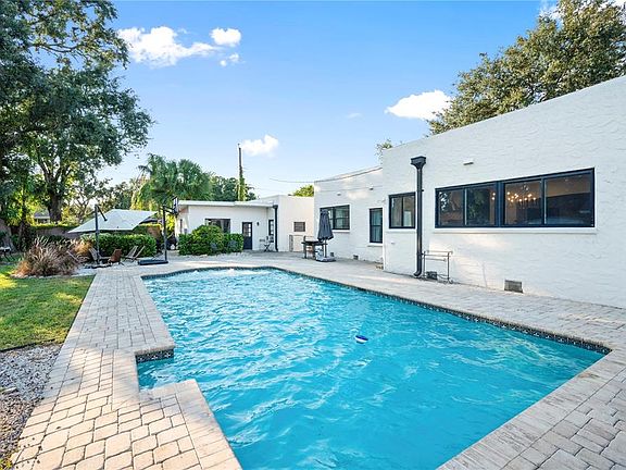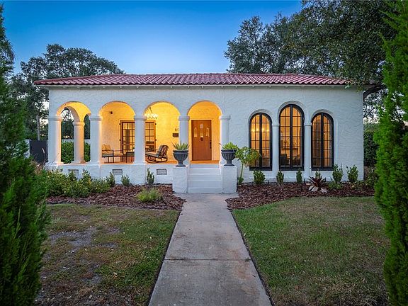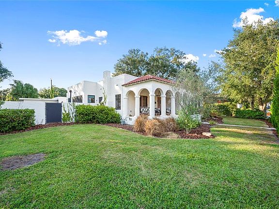 Welcome to this iconic 1925 Spanish Colonial in the coveted Biltmore-Cumberland Historic District of Lake Hollingsworth. Dressed in stucco, columns, and graceful arches, this residence stands as an anchor of neighborhood history and architectural character. Known as the Ludd M. Spivey House, this property once belonged to the Florida Southern College president who invited Frank Lloyd Wright to redesign the campus. It’s said that Wright himself visited this home, meeting in the arched, sunken living room that still radiates timeless charm. The main home offers 4 bedrooms and 2 full bathrooms across 2,842 sq. ft., blending historic warmth with modern comfort. A moody hallway illuminated by gold globe lighting leads to the bedrooms, including a Jack-and-Jill suite and a spacious primary just across from a full bath. A flex room or office with French doors and a wood-burning fireplace anchors the front of the home and opens onto a welcoming front porch. At the heart of the home lies a 2021 remodeled kitchen, surrounded by natural light and backsplash tile reaching to the ceiling. Outfitted with Thermador appliances, including a 36” gas range, convection microwave, and designer hood vent, this kitchen boasts quartz waterfall countertops and a generous island with bar seating. Engineered hardwood floors flow throughout, creating a seamless and cohesive design. Outdoors, a resurfaced pool with tanning shelf, Spanish-style tile, and lush new landscaping form an inviting private oasis. The 555 sq. ft. guest apartment includes a 1-bedroom layout with a living room, kitchen, and full bath — ideal for guests or rental income. Situated on nearly half an acre, this historic home comes with a new roof installed prior to closing, ensuring both preservation and peace of mind. Enjoy proximity to Lake Hollingsworth, Florida Southern College, local eateries like The Peach House, and Black & Brew, making this residence a perfect blend of history, style, and location.