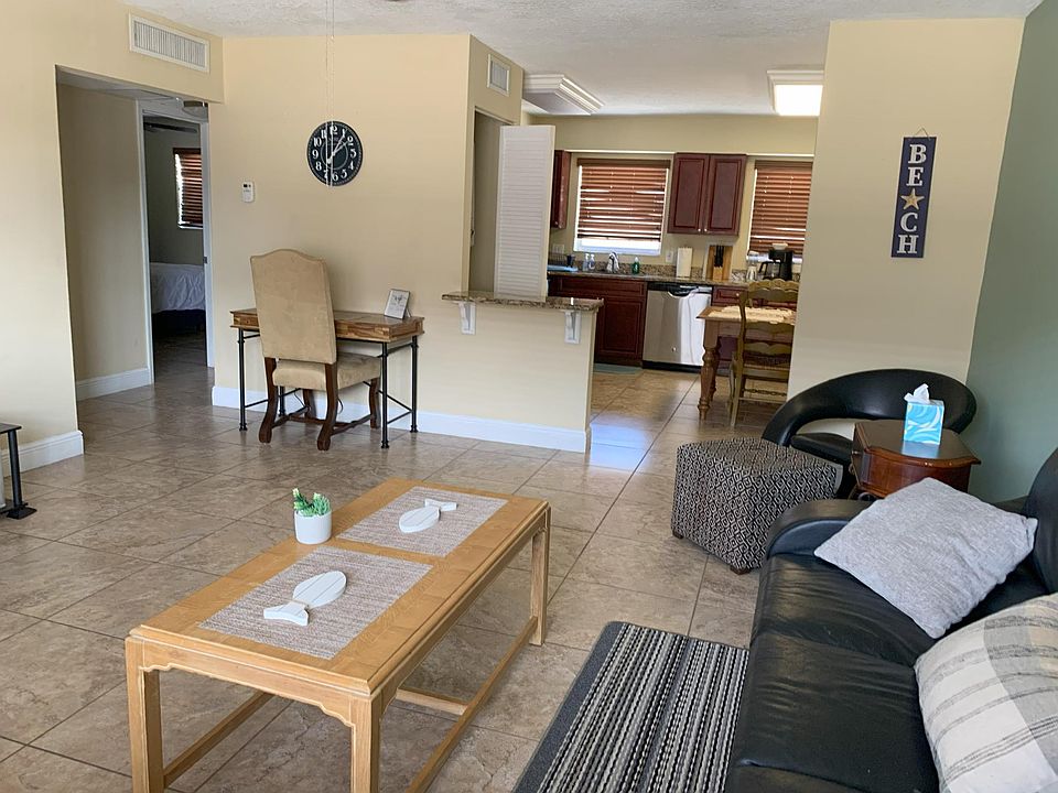Spacious Riverfront 2 bedroom/1 bath ground floor apartment in a great location near our World Class beaches, shopping, restaurants, golf & more! This remodeled Apartment in small 10 unit community features all stainless steel appliances, granite counters, stack washer/dryer in unit, spacious rooms & huge walk in closets! Bath has seperate vanity area for extra privacy. Assigned parking at your doorstep. Patio on the river offers a bbq area for guests with tables, chairs, hammock, & private fishing dock! Enjoys sports on the community yard. Pet Friendly!