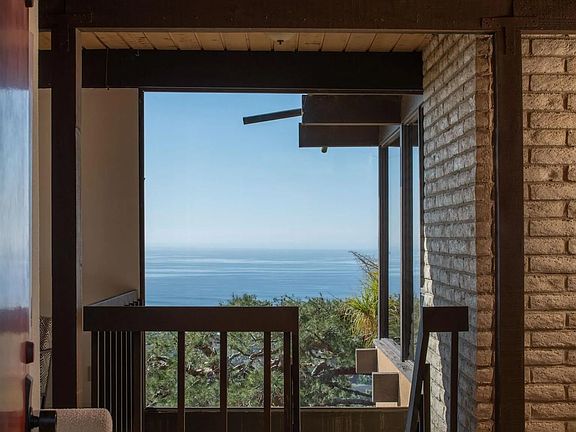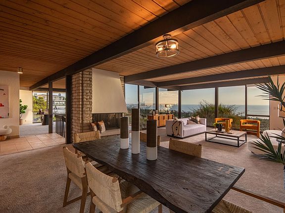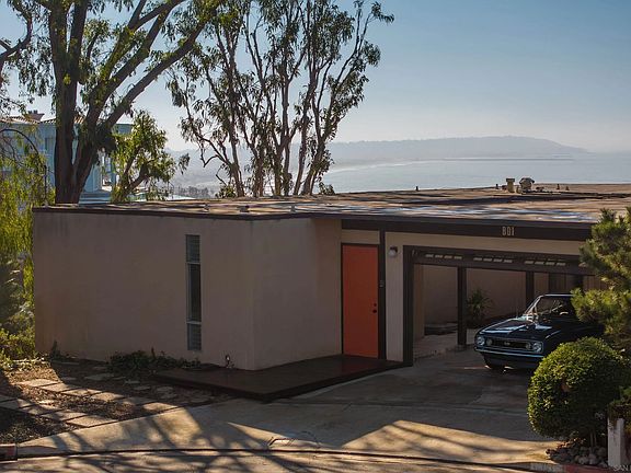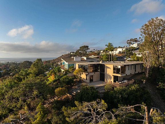 Endless views of breaking waves, sunsets, the coastline, and Mission Bay abound from this 1967 Mid-Century residence presiding on .74 acres at the end of a canyon cul-de-sac in a quiet La Jolla setting. This hidden gem is beautifully integrated into its coastal hillside location with an unassuming visage from the front exterior and captivating views from the minute you enter the home. The light-filled open concept interior showcases beamed ceilings and dramatic floor to ceiling windows to enhance the natural beauty surrounding this property. With living areas, fireplace, kitchen, 3 bedrooms + office, 2.5 baths, laundry, and parking conveniently situated on the entry level, single-level living is easily obtained if desired. Downstairs features a family room that opens to a terrace and beyond to your large canyon lot including a bonus storage room beneath the home.