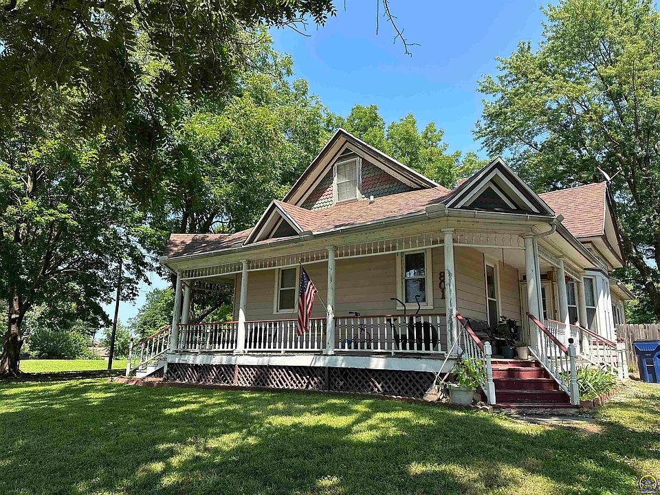 Investment Opportunity! Take a look at this massive bungalow on a large lush corner lot in the center of Oskaloosa KS. Much of the original structure is still in tact with intricate carpentry work, decorative trim, Waynes coat, tall trim, and artistic inoperable fireplaces with some of the original tile work from its original build. This house is HUGE and has so many options with a little TLC to revitalize it. It offers 4 bedrooms and 3 bathrooms. Three bedrooms located on main level with two full bathrooms and two fireplaces. Separate laundry room. Small mudroom with stone basement access. Two storm doors to access side yard and enormous backyard. Upstairs is a great room that can be used as living space, a bedroom, or a recreation room complete with full bathroom. Access to the extra room is from the main living room. Three other bedrooms are located off the main living/diving room area. Two full bathrooms on main level. Decent kitchen space with tall ceilings, tiled floor and it is located to the washer/dryer room and framed in side porch. Outside the home is a prominent wrap-around porch with plenty of space for seating. Behind the house is a metal outbuilding with concrete flooring. The lot is a corner lot totaling .33 acres filled with various trees offering plenty of shades and walnuts for picking! The property is currently occupied so interior photos are available upon lender approval letter as well as serious buyer inquiry. Contact listing agent.