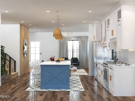 The open-concept layout showcases modern dark flooring, soaring ceilings, and a sun-drenched kitchen with sleek white cabinetry, a striking white oak island, and premium Forno appliances. Brushed gold fixtures and thoughtfully selected finishes add a refined coastal touch, while natural light flows effortlessly throughout the home.