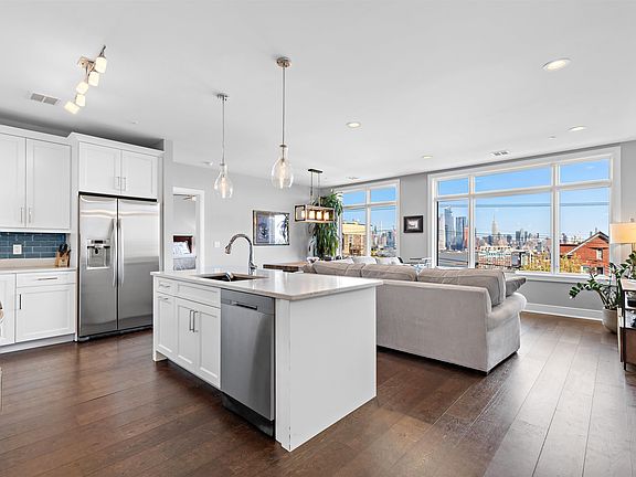 Spectacular east-facing two bedroom and two bath corner condo with two garage parking spots, offering breathtaking panoramic New York City and Hudson River Views. This condo is bathed in sunshine and offers almost 1,200 square feet of living space with oversized Pella windows to take in the incredible view. The living area is spacious and wide-open to the chef’s kitchen, which has been superbly designed with quartz countertops, double depth under mounted sinks, white cabinets and stainless steel appliances. This condo comes equipped with seven inch hardwood plank floors throughout, in unit washer and dryer, bedroom ceiling fans, central air and heat. The stunning master bath is surrounded by imported tile, marble, quartz and a frameless glass shower enclosure with a rain shower head. This elevator building offers a stylish lobby, beautifully landscaped backyard and patio perfect for barbequing and entertaining. Conveniently located to New York City and metro area transportation with a bus stop in front of the building. Close to shops, dining, parks and minutes from Trader Joes in uptown Hoboken.