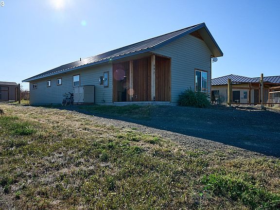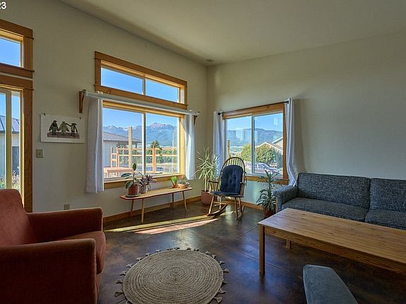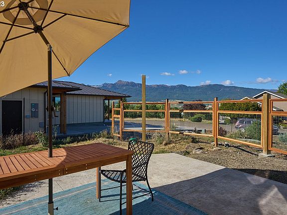 A modern-contemporary designed home with solar electric benefits! Built in 2019 this 3 bedroom, 1.5 Bath home offers efficient and affordable heat featuring lovely stained concrete floors and in floor heat throughout home. 32 solar panels on roof and a net meter system covers most of electric bill and that includes heat, hot water and household power. The homes' design and layout offers wonderful natural light and an open floor plan of kitchen/dining and living room area. There are many windows to enjoy the mountain view from. Sliding glass doors lead to the concrete patio and yard. The 1/2 bath has a stacking washer and dryer which is included. Full bath has a pocket door separating tub/shower and toilet from a 2 sink vanity. The yard has not been landscaped leaving an opportunity for you to create the outdoor living space that you desire. Extra storage in shed which is included. Great location in Enterprise in a quiet neighborhood of newer well kept homes. Close to school and hospital.