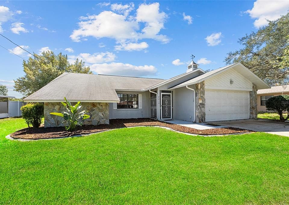 NEW ROOF (March 2024)! No HOA/CDD! Terrific opportunity to get in the market. Great home with great bones & numerous upgrades completed. NEW ceramic & LVP floors (no carpet), front yard irrigation, water softener, remodeled master shower, granite countertops, and stainless steel appliances. At entry is the living room, boasting high ceilings with view of kitchen + backyard via tall glass sliders. Floor plan feels larger than 1,279sf (total sf = 2,128sf). Kitchen is very spacious and leads to a lovely trio of large windows including brand new blinds. Laundry room including washer & dryer is located just off the 2-car garage, and the lanai is right next to the kitchen for easy grilling & outdoor enjoyment. The master bedroom is a good size which can accommodate a king size bed, and the ensuite bathroom comes with unique granite countertop in half-moon shape and good size step-in shower with beautiful wall tile & stone floors. Large closets in both bedrooms. Lovely neighbors share the street, and the location is very convenient to the many stores & shops on US19. Schedule your showing today!