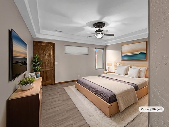 Beautiful custom home in the Petroglyph Estates subdivision with amazing views! The living room features a cozy fireplace, perfect for those chilly evenings. The kitchen is a chef's dream with all stainless steel appliances, a kitchen island for extra prep space, and an accent backsplash. The primary bathroom with double sinks, a separate tub, and shower. The primary bedroom features a spacious walk-in closet. The kitchen also includes a walk-in pantry for ample storage. Partial flooring replacement adds a fresh touch to the home. The outdoor space is equally impressive with a covered patio for entertaining. The fenced-in backyard is perfect for privacy and comes with low maintenance landscaping. This property is a must-see for those seeking a comfortable and stylish living environment.