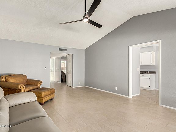 Welcome to this charming home in the 55+ Sunland Village East! Golf Course lot on the 7th Hole Green! This gem offers 3 Beds + Den/Office, 2 Baths, desert landscape, and a 2-car garage w/cabinets and a golf cart garage! The interior features vaulted ceilings, tons of natural light, neutral paint, and new tile floors! Great floor plan with a large living room & a separate family room with amazing views! The eat-in kitchen boasts new black stainless appliances and solid-surface counters! The main bdrm has a private bath with a beautiful walk-in shower and walk-in closet. You'll love the backyard's covered patio that can be fully enclosed with roll-down shutters, providing versatile use - whether you want added privacy, climate control, or security! Plus, golf course views as your backdrop!