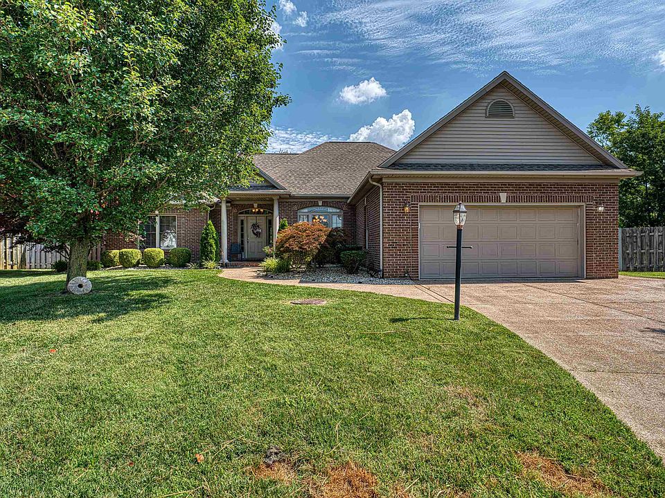 WOW! Come see this beautiful, all brick ranch home in Newburgh with nearly 2000 sq ft. You'll be impressed with the quality throughout this award winning home built by Brian Stevens. Custom hardwood cherry flooring accentuate the entry, dining room and great room. Other highlights include crown molding, tray ceilings, custom cabinetry and bookcases, plus upgraded kitchen cabinets and more. The split bedroom design provides privacy for the primary suite. It offers his/hers closets, a walk-in shower along with a garden tub and dual vanity in the private bath. The spacious kitchen features stainless appliances, raised breakfast bar, plenty of cabinets, solid surface counters, and a large eating area to overlook the backyard. Enjoy the peaceful, private setting on the expanded deck overlooking the pond. Per seller, many updates including a/c & water heater in 2020, furnace 2017, range 2025 and dishwasher 2022. Seller is providing a 1 year AHS home warranty ($475). Sale includes kitchen refrigerator, range/oven, bar stools, TV & bracket in kitchen, washer & dryer, TV bracket in great room, ring door bell, and all window treatment. Great room TV excluded.