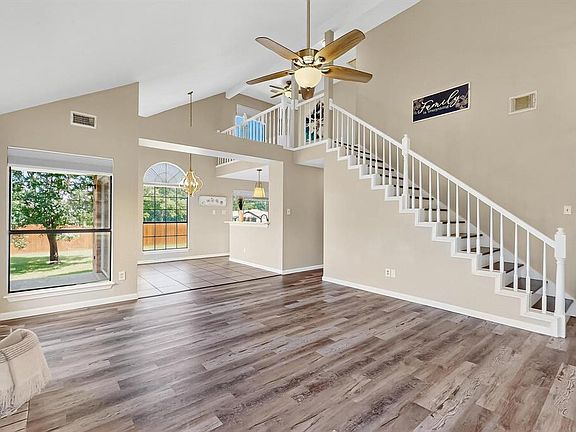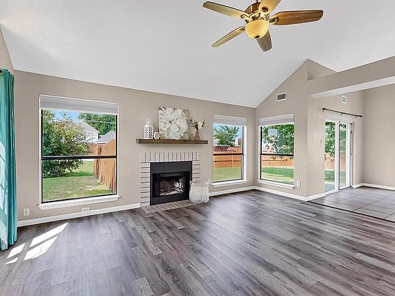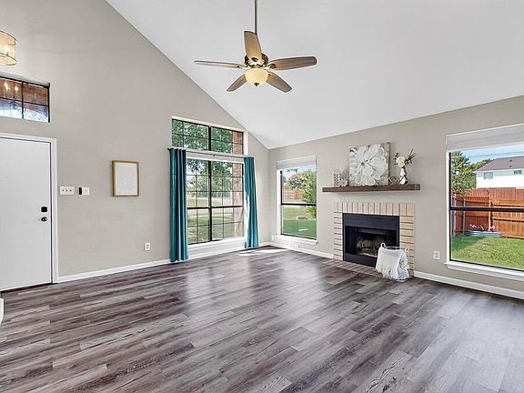 Set on a spacious quarter-acre corner lot, this updated two-story home backs to open green spacepart of a privately owned six-acre homesiteoffering rare backyard privacy with no direct rear neighbors. Step inside to find cohesive updates throughout, including wood-look vinyl plank flooring, modern lighting and fixtures, and ceiling fans in every bedroom as well as the living room. The family room features a high vaulted ceiling, anchored by a tile-surround wood-burning fireplace and filled with natural light from large windows. An adjacent dining area opens to the backyard through double sliding doors for seamless indoor-outdoor flow. The refreshed kitchen includes quartz countertops, a deep undermount sink, white cabinetry with updated hardware, and stainless steel appliancesincluding a built-in microwave, dishwasher, French door refrigerator, and smooth-top range. The quartz-topped breakfast bar opens to the dining areaperfect for casual dining or entertaining. The downstairs owner’s suite features a cozy window seat, dual closets, and an updated en-suite bath with a quartz-topped double vanity, knee space, updated fixtures, framed mirrors, and an oval soaking tub with shower. Upstairs, a loft overlooks the living area and leads to two secondary bedroomseach with walk-in closetsand a fully updated hall bath with quartz vanity, framed mirror, and updated fixtures. Outside, you'll enjoy a generous, private backyard shaded by mature trees with plenty of room for play, gardening, or future enhancements. A spacious storage shed provides additional space for lawn equipment and tools. Notable updates include a 2022 HVAC system and a roof in 2018. Situated in an established neighborhood near Lake Ray Hubbard, this move-in-ready home offers comfortable living on a private, generously sized lotall located within minutes of PGBT, I-30, shopping, outdoor recreation, dining, and entertainment venues. Call now to schedule your showing today!