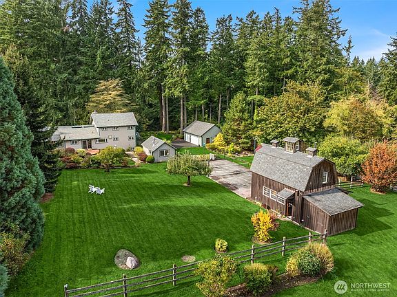 Enjoy quiet sanctuary in this beloved neighborhood in the heart of Bainbridge Island. Beautifully appointed home on 1.66 sunny, level acres. Expansive gardens surround multiple outdoor spaces, including fun sport court, firepit and stunning cottage style barn, an ideal home gym or hobby space. Don't miss the separate studio/office and a 3 car garage. Home features two private primary ensuite bedrooms on main, plus 3 bedrooms and full bath upstairs. Recently remodeled kitchen, granite, stainless appliances; Wolf Stove. Custom Ipe deck, hot tub and generator. Close to water’s edge and Gazzam lake trails. A rare opportunity to enjoy country living with modern convenience and a fabulous property to build memories.