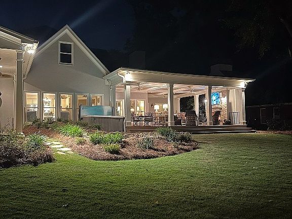 Nestled among mature trees and overlooking Wynlakes Golf Course holes 13 and 14, this elegant home perfectly balances timeless design with modern comfort. A wide front porch with graceful arches invites you in, while the recently added expansive, covered back porch-with its coffered ceiling, outdoor fireplace, and built in gas grill-offers a serene, private retreat where you can relax or entertain with views of the woods and a peaceful creek. The professionally landscaped and lighted backyard features a fantastic hot tub, waterfall and koi pond, creating a private outdoor oasis. Inside, warmth and sophistication abound. Beautiful hardwood floors flow through the entry and formal dining room (with hand-painted mural on one wall by local artist).
