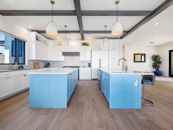 The gourmet kitchen serves as a focal point, featuring crisp white cabinetry accented by a bold blue island and premium Thermador appliances for efficient, high-end meal preparation. Expansive pivoting glass doors open to a covered lanai and infinity-edge pool, creating an ideal setting for evening gatherings as the sun sets over the Pacifican entertainer's haven designed for memorable occasions.