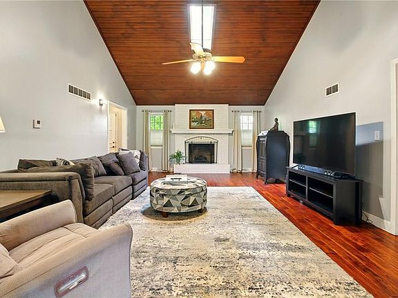 Step into a spacious entryway with a coat closet. The cozy family room features manufactured hardwood flooring, wood-planked vaulted ceilings, and a gas fireplace—ideal for cozy nights in. The living room is a true highlight with five oversized floor-to-ceiling windows offering gorgeous treed views and stunning sunrises.