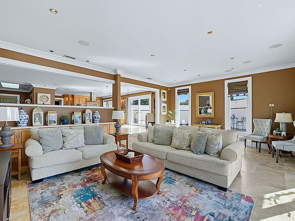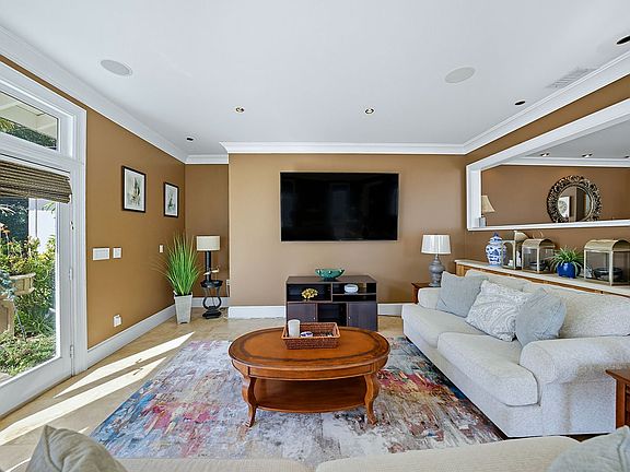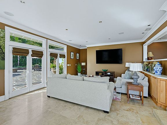 Inside, the chef's kitchen boasts a marble butcher block island with 6 Thermador burners, a Kobe range hood, and built-in Subzero Frigidaire refrigerator and freezer. A sunken family room with 85" Sony TV, skylights, and French doors opens to the pool. Travertine marble floors flow throughout, with a dedicated office and two large bedrooms with walk-in closets. The master suite rivals a 5-star hotel with newly remodeled bathroom, bay window, and huge walk-in closet.