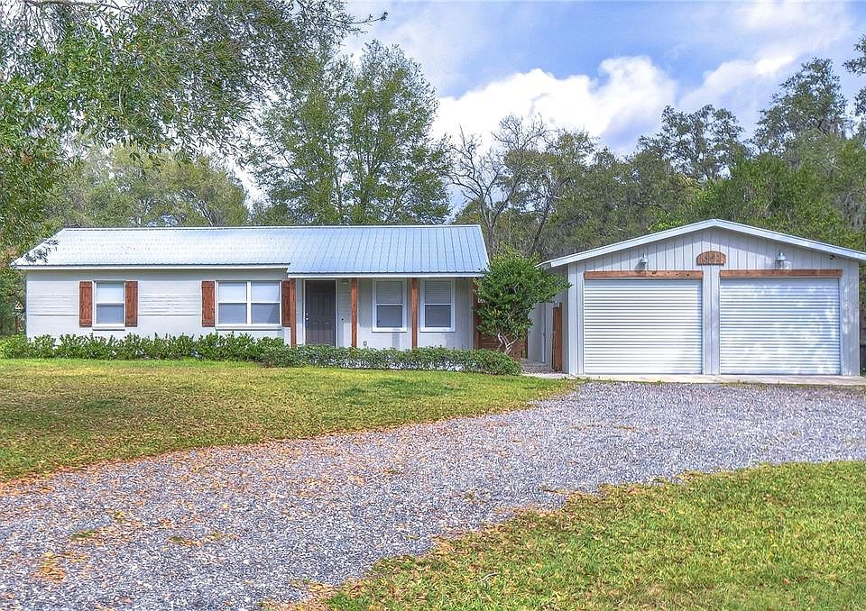 Welcome to your dream come true! This home has been completely remodeled and is truly stunning! Sitting on just under one, fully fenced acre, you will love all the space that you and your family will have to play! You will also find a detached 4-car tandem garage that is accessed by a covered walkway from the home, did I hear someone say “dream workshop”? Arrive and notice the contemporary farmhouse accents including natural wood shutters & beams! You also have a metal roof so you can enjoy the sounds of the Florida rainstorms! Over the pavered front porch and through the front door you arrive at the living area! Notice the wood look tile floors and desirable paint colors that suit any décor! Open to the living area is the dream kitchen with desirable cabinets, stainless appliances, center island, subway tile backsplash & desirable wooden counters! There is a door from the kitchen to a spacious wooden deck for those who like to dine al fresco! This is a wonderful space where you can spend time appreciating the spacious backyard! Off of the kitchen there are 2 bedrooms that share an updated bath! On the other side of the home there is another large room that is accessed by a barn door and features a gorgeous tongue and groove ceiling! This room could easily be used as a primary suite with the addition of a closet! Attached to the room is a half bath with washer & dryer hookup! The door from this room leads you to a covered walkway that takes you to the HUGE detached garage! You could use this space to store your vehicles and other toys and you will even have enough space to partition off an area to use as a workshop! There is even a large covered carport for extra storage! The property with this home is stunning and will afford you all the privacy you will need! Come take a look, you will not be disappointed!