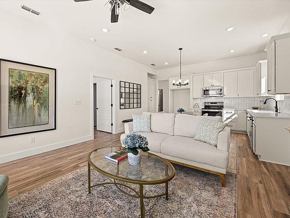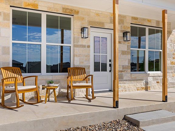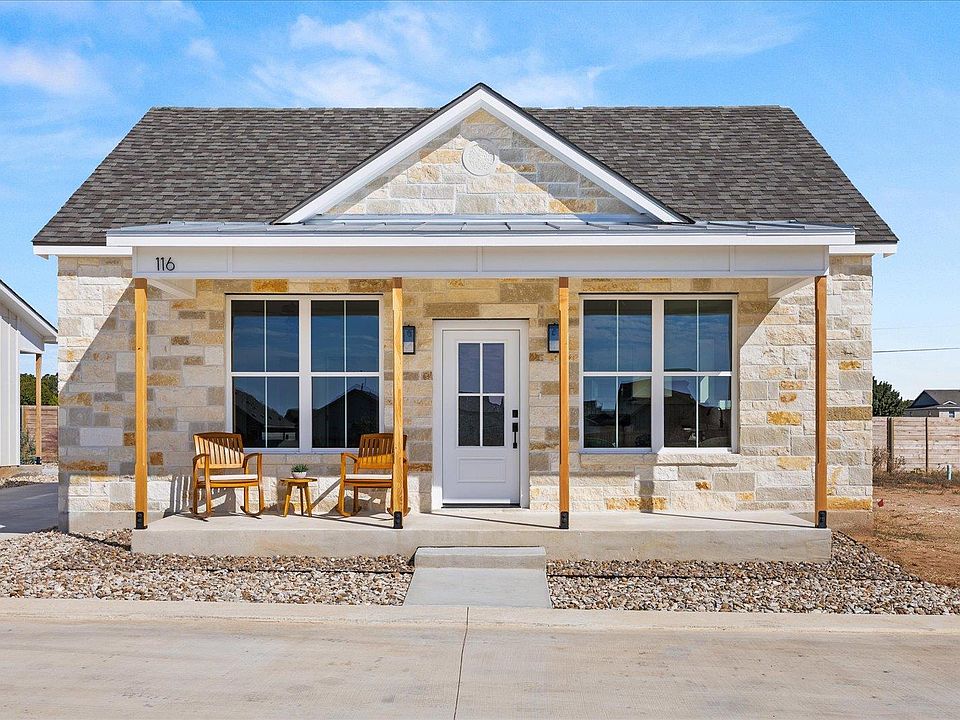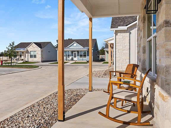 Cottage 116 showcases the sought-after Lange design. This 2-bedroom, 2-bath home offers a light-filled layout and inviting eat-in kitchen, paired with wood-look tile flooring throughout and thoughtfully selected designer finishes. The exterior features a Texas-blend stone façade and a welcoming front porch, capturing classic Hill Country charm. Located in The Alora Mae, a fully lock-and-leave community, homeowners enjoy carefree living with all lawn and common-area maintenance included. Neighborhood amenities feature a fenced dog park, pergola, and firepit. Covered parking is available.