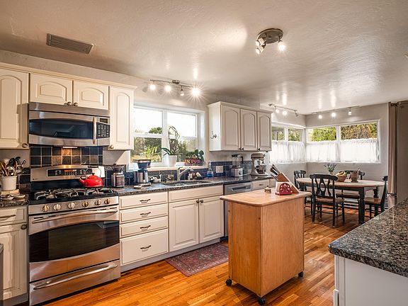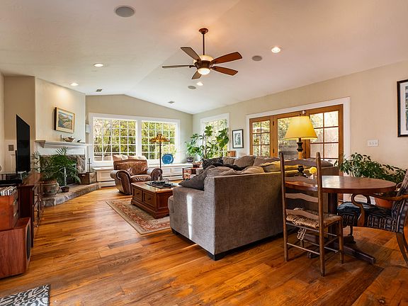 Nestled in the heart of Lee Acres, this charming 1-story 4 bdrm. home is truly a gem in the coveted North Valley. A picturesque 1/2 acre corner lot complete w/ditch access & Anderson Field open space just steps away, this home offers the perfect blend of serenity & convenience. 2 living areas exude warmth and comfort. Large family room features beautiful hardwood floors, plenty of windows that provide lots of natural light, & a cozy fireplace. The dining room offers ample space for hosting gatherings. Eat-in kitchen boasts many updates such as white cabinets, granite countertops, and stainless steel appliances. The main bath has also been updated, featuring a double vanity & stylish finishes. The backyard is a perfect oasis w/lush greenery, mature trees, hot tub and a spacious patio!