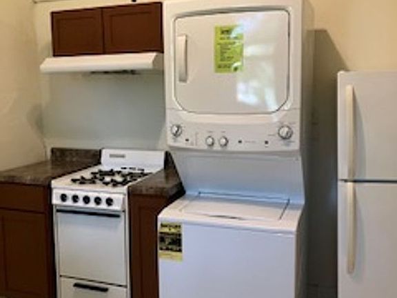 The thoughtfully arranged kitchen comes equipped with a gas stove, refrigerator, and a stackable washer and dryer for your convenience. The bedroom features paneled walls, tall ceilings, and a generous closet with ample storage. An efficient full bath completes the unit.