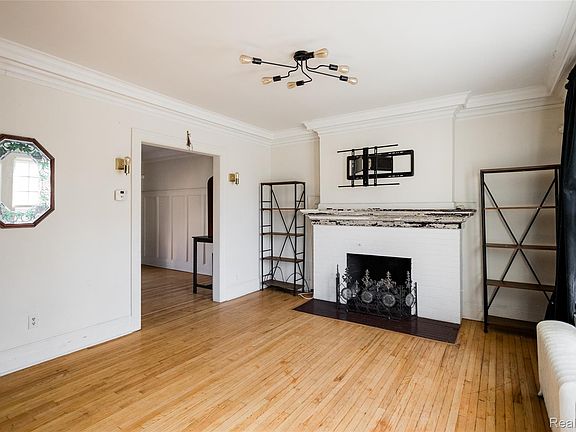 This charming three-story, three-bedroom row house in New Center features hardwood floors throughout, including the third-floor bedroom suite. Warm neutral rooms are balanced by dramatic dark accent walls and vintage mood lighting. On the first floor, covetable features range from the fireplace in the spacious living room and wainscoting in the dining room to the sun-lit kitchen with stainless-steel appliances and subway tile backsplash. Upstairs, a hallway with a built-in linen closet anchors a pair of bedrooms, one with an appealing alcove space-- ideal for sitting room/nursery/dressing nook-- and a renovated bathroom in dark mossy green and hexagonal-tile floor. The marvelous sunlit third floor is optimal for a playroom, home office, gym or studio. The refinished basement includes updated bathroom with a dog-friendly walk-in shower. Close to Q-Line, Fisher Building, Tech Town, Henry Ford Hospital, Lincoln Square Art Park, and acclaimed restaurants like Oak & Reel, Freya, and Baobab Fare.