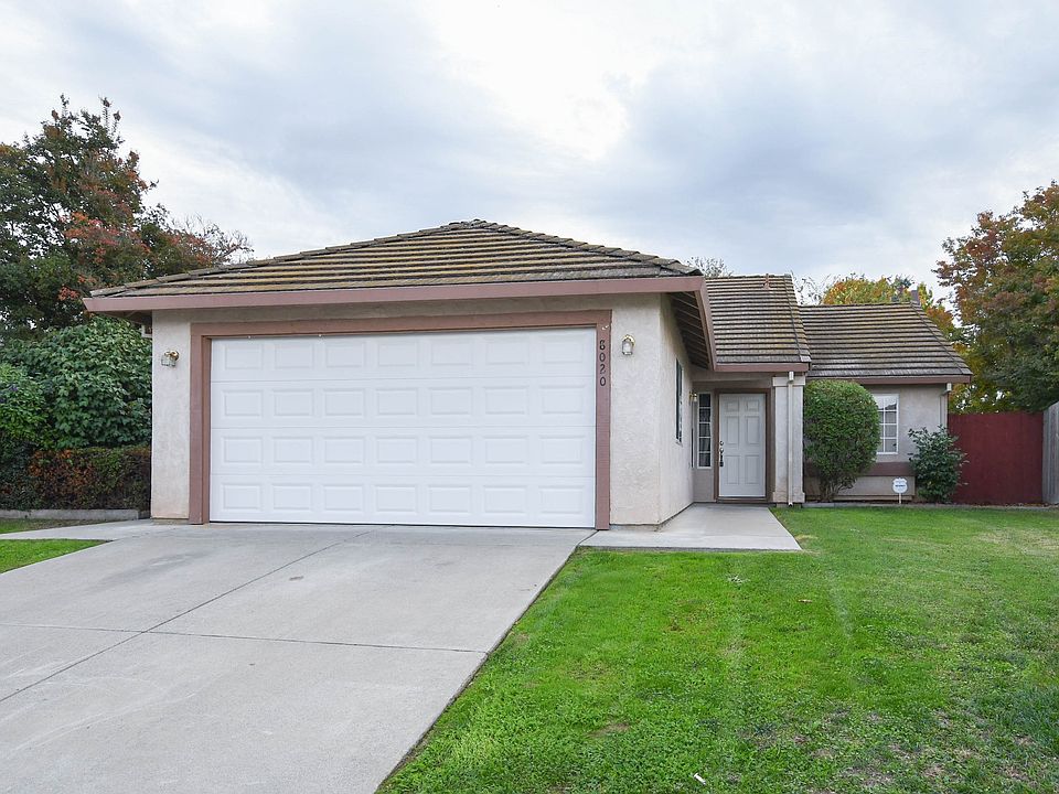 Very nice home on cul-de-sac lot in a great location. New hard surface flooring in all areas that are not ceramic tile. New interior paint. Large great room with vaulted ceiling with dining area in kitchen. Kitchen has newer stove and new dishwasher. Large primary bedroom with walk-in closet, laundry closet in hallway. Two car garage with work bench and shelving and new garage door and opener. Door off great room to patio and huge back yard. Landscape service included. Lot back up to Foulks Park, close to Elitha Donner Elementary School. Contact listing broker for 3-D tour link.