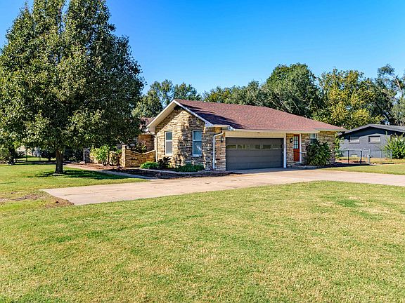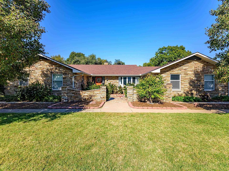 Welcome home to this beautifully maintained full brick ranch in west Wichita! Sitting on nearly half an acre, this spacious 4-bedroom, 3.5-bathroom home offers the perfect blend of comfort, charm, and functionality. Step inside to a warm and inviting layout featuring a floor-to-ceiling stone fireplace that anchors the dining room- a stunning focal point for family gatherings or cozy evenings in. Enjoy the wood flooring, large bedrooms, and plenty of natural light throughout. The main floor includes 3 bedrooms and 2.5 baths, while the finished basement adds a 4th bedroom, a 3rd full bath, a dry bar, and a generous storage room- ideal for guests or entertaining. Outside, you’ll find a large front yard shaded by mature trees offering privacy and curb appeal. The front paver courtyard provides a welcoming entryway, and the fully fenced backyard is designed for both relaxation and practicality- complete with a storage shed, paver patio areas, planter beds, and grassy space for play or pets. This home has been nicely maintained and is ready for its next owner to enjoy. Don’t miss the opportunity to own a solid, stylish ranch with space to spread out inside and out!