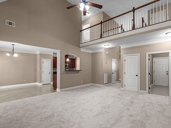 The chef's kitchen offers granite countertops, stainless steel appliances, a closet pantry, and abundant cabinet space—opening seamlessly into the great room with soaring ceilings and a cozy fireplace.
