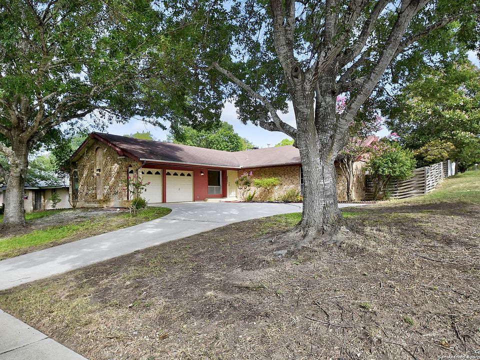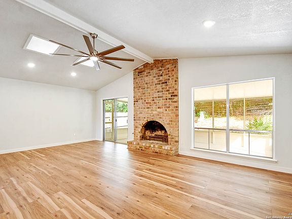 ****OPEN HOUSE 10/25 11AM-2PM****Modern charm meets timeless comfort in this fully renovated single-story gem, nestled in the heart of Live Oak. Step into a bright and airy living space featuring soaring vaulted ceilings, stunning skylights, luxury vinyl plank flooring, and a dramatic floor-to-ceiling brick fireplace as the focal point. The open-concept layout flows seamlessly into a sun-drenched enclosed patio, perfect for relaxing or entertaining year-round. The entire home has also been updated with up-to-code electrical work, offering peace of mind alongside aesthetic upgrades. The kitchen is a true standout, featuring expensive marble backsplash, butcher block countertops, stainless steel appliances, and modern white cabinetry-blending warmth, function, and style. Both bathrooms have been beautifully remodeled with sleek tile work, custom vanities, and contemporary finishes that bring a spa-like feel to everyday living. Each bedroom offers ample natural light, generous storage, and stylish ceiling fans, while the primary suite includes a sliding barn door leading into a walk-in shower retreat. Every detail has been thoughtfully considered, from fresh paint to upgraded fixtures throughout. Located in an established neighborhood with easy access to major highways, shopping, dining, and parks along with close proximity to Randolph Air Force Base- 8021 Harper Valley St is move-in ready and waiting to welcome you home!