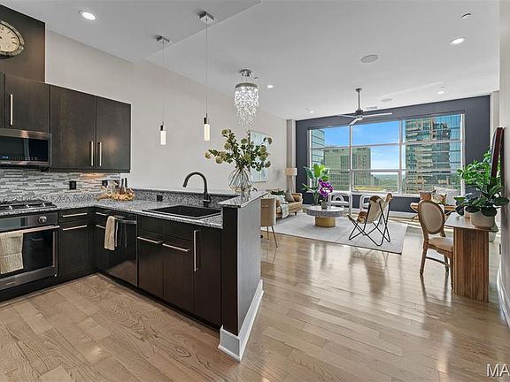 Original owner, meticulously maintained and updated. A superior 2 bedroom / 2 full bath condo in the sought after community of Maryland Walk in the heart of Clayton. This home is a favored floor plan with open airy spaces - hearth room open to dining room and kitchen and surrounded by floor to ceiling windows offering a two directional view from the 8th floor - STL skyline to the east and the Clayton skyline to the south. A south-facing terrace with room for lounging. A primary suite with full bath situated a lovely distance from the guest bedroom and 2nd full bath plus open hearth room to kitchen, making for plenty of elbow room when entertaining. Separate laundry area that is located away from the kitchen area unlike others in the community. Automated window treatments, 2 parking spots located next to each other on level G-2, #276 & #277 plus secure storage unit on level G-2, #U-30. Meticulously maintained and an impressive improvements list. In-house management, lobby attendant, pool, fitness room, media room, board room, dog park plus 3 renovated guest suites available for owner’s guests. Walk to Clayton’s business district, shopping, parks, renowned Clayton Schools and many culinary delights. This one is truly special!