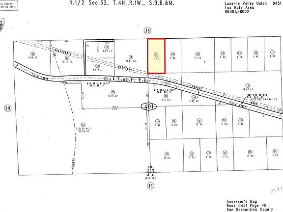 5 acres of land in the Lucerne Valley mountain range. This is a great property for someone who wants privacy. At one time there was a cabin built on the downward SW corner of lot, that took advantage of gorgeous views of the town (all that remains is the cement slab approx 20x24). This land is located near the railroad tracks and power towers. Utilities: Electricity none on site needs to be installed and connected, there are electric poles near the N/W corner of parcel. No water on site - would have to drill a well or have water hauled. No gas on site - would have to install a propane tank. No fencing. This lot is about 5 minutes from paved county road, the actual site is on a non-maintained county road. OHV trails nearby. Buyer to verify all information prior to closing. CASH only. GPS coordinates: 34.398135, -117.007155