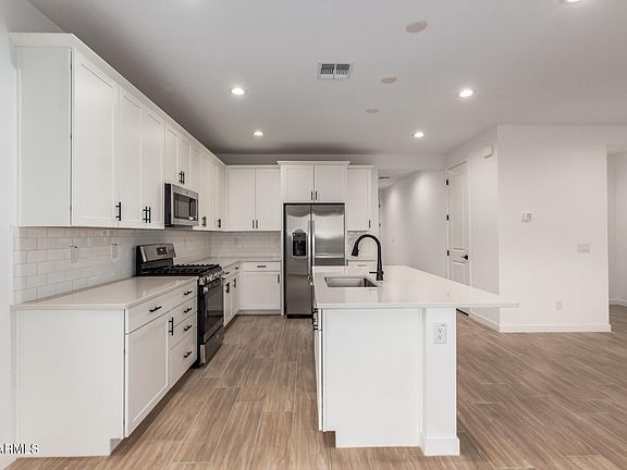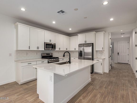 Located in a gated community featuring a splash pad, playground, and open green spaces, and just minutes from I-10 for convenient access to shopping, dining, and major employment hubs, this Moonstone floorplan perfectly blends comfort, function. Welcome home to a spacious two-story design offering 4 bedrooms, 2.5 baths, a study, and a versatile upstairs loft. From the moment you enter, you'll feel the openness of the great room with 9' ceilings (8' second floor), flowing seamlessly into the dining area and designer kitchen featuring stainless-steel appliances, gas cooking, a large island, and walk-in pantry. The main-level bedroom and full bath make the perfect guest suite or private home office. Upstairs, discover a bright loft for movie nights or a game room, with 9' ceilings (8' second floor), flowing seamlessly into the dining area and designer kitchen featuring stainless-steel appliances, gas cooking, a large island, and walk-in pantry. The main-level bedroom and full bath make the perfect guest suite or private home office. Upstairs, discover a bright loft for movie nights or a game room, along with a luxurious primary suite boasting a huge walk-in closet and spa-style bath. Paver driveway, front yard landscaping, tankless water heater, gas stub at the patio, as well as a soft water loop. Enjoy Arizona evenings on the covered patio, all within a gated community featuring a splash pad, playground, BBQ's, and green spaces, just minutes from convenient I-10 freeway access.