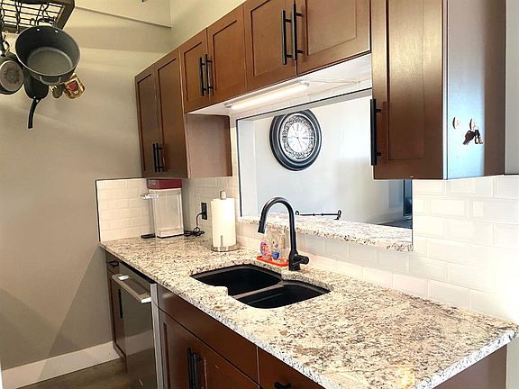 Fresh paintChic granite countertopsGalley style kitchenRich cabinetryStainless steel appliancesStylish backsplashEat-up bar