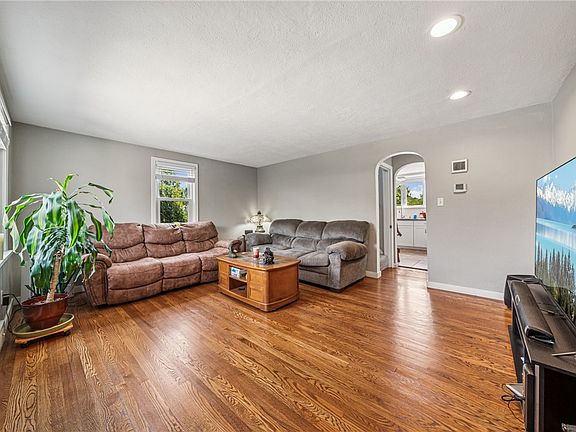 Porcelain tile tub surroundSleek black stainless-steel appliancesWooded privacyRefinished hardwood floorsCeramic tile flooringCovered patio