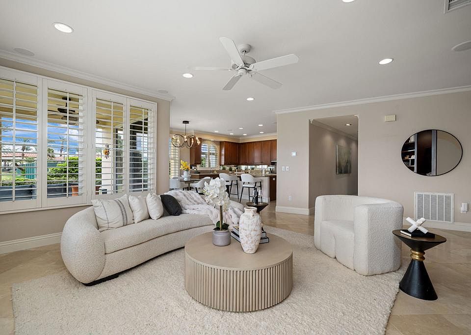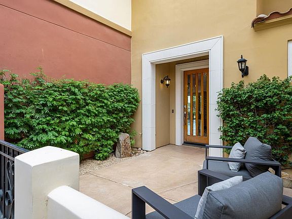 Luxury Condo in Mountain View Country Club, La Quinta, California3 Bed | 3.5 Bath | Prime Golf Course LocationWelcome to your dream desert retreat! This beautifully appointed 3-bedroom, 3.5-bath condo is a rare new listing located on the 9th hole of the prestigious Mountain View Country Club in La Quinta. Enjoy sweeping views of the fairway and green from your private patio in one of the most sought-after locations within the community.Inside, you'll find elegant travertine flooring throughout the main living spaces, complementing a gourmet kitchen equipped with high-end KitchenAid appliances, granite countertops, a spacious island, and stylish bar seating--perfect for both cooking and entertaining.Each bedroom is en-suite, offering ultimate privacy and comfort. The expansive primary suite includes a spa-like bathroom with a soaking tub, separate shower, dual vanities, and a generous walk-in closet with built-ins. Two guest bedrooms each feature private baths, plus there's an additional powder room for guests.Additional features include a large laundry room with a deep utility sink, and a built-in office space tucked away for productivity without intrusion.Located at the end of a quiet cul-de-sac, this home offers both privacy and convenience, just steps from the tennis and pickleball courts.Community Amenities Include:Championship golf courseVibrant clubhouse with fine dining and year-round eventsState-of-the-art fitness center with yoga, Pilates, and spin classesOlympic-size pool with aquatic classes8 meticulously maintained pickleball courts with vibrant organized playTwo Tennis courts just steps away from your condoLive the resort lifestyle in one of La Quinta's most desirable gated communities. Schedule your private tour today!There is a one-time membership transfer replenishment fee paid for by buyer $10,000Condos in Mountain View Country Club are currently being repainted exterior. New colors are fabulous!