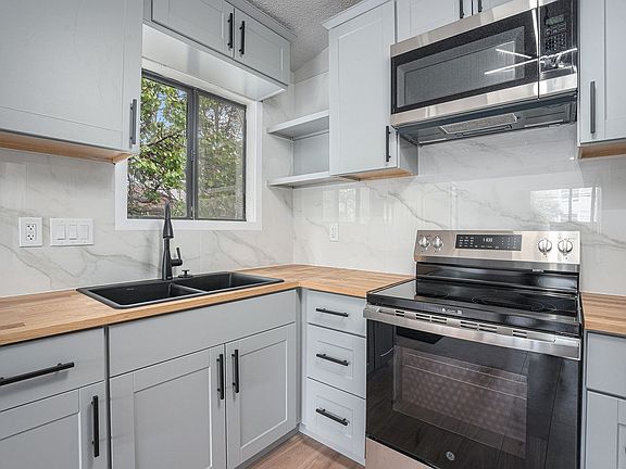 Modern cabinetryTile and modern fixturesVaulted ceilingFresh paintNew flooringStainless steel appliancesButcher-block counters