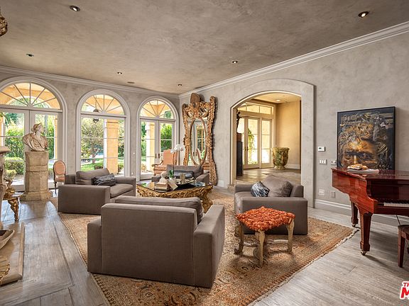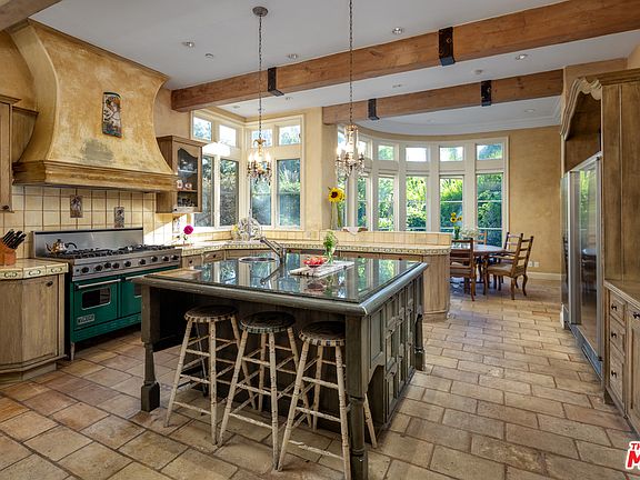 Richard Landry estate that offers many luxurious features and privacy. Grand foyer leads to formal living spaces with elegant details throughout--large living, dining and family room including a separate office with rich wood paneling. European farmhouse kitchen with Viking appliances and a lovely breakfast nook. Huge master suite with romantic balcony and two large closets. Property offers 6 bedrooms and 6.5 baths. Perfect for entertaining with several outdoor patio areas. The tranquil backyard includes a swimming pool, spa and tennis court plus a detached island studio. Property has a gated driveway with motor court and 2-car garage. Situated in the prime Beverly Hills flats.
