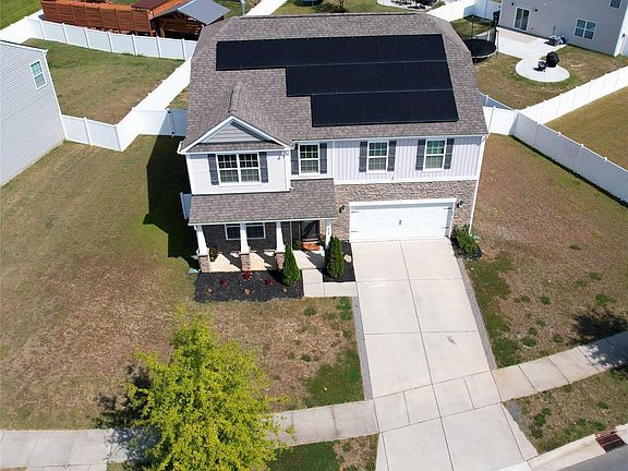 This stunning 4-bedroom, 3.5-bath home truly shows like new and has many upgrades. The open floor plan is filled with natural light and features a spacious dining room that flows seamlessly into the family room, kitchen, and breakfast area. The kitchen is a chef’s dream with stainless steel appliances, a 5-burner gas stove, granite countertops, white shaker cabinets, a center island, and a large walk-in pantry. A convenient office/flex room is located on the main level right by the front door. Upstairs, the huge primary suite boasts vaulted ceilings, a ceiling fan, and a luxurious bath with dual sinks, a private toilet, a walk-in shower, and an oversized walk-in closet with built-ins. Three additional bedrooms, each with their own walk-in closets, provide plenty of space for family and guests, and one of the bedrooms has direct access to the hall bath. The upper level also offers a versatile loft area that can be used as a second family room, playroom, or media space, along with a laundry room for added convenience. The backyard is large, flat, and fully fenced with a 6-foot white vinyl privacy fence perfect for entertaining year-round. LVP flooring was added to all of 2nd level. House was recently painted in neutral and tile was added to primary bath and laundry room Sept 2025. House is wired for ATT wireless. Additional features include $38K solar panels with transferable warranties that will be fully paid by seller at closing and a transferable ADT security system. Ideally located close to Hwy 485, shopping, and dining, this home is truly move-in ready and waiting for its next owner.