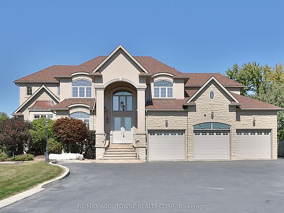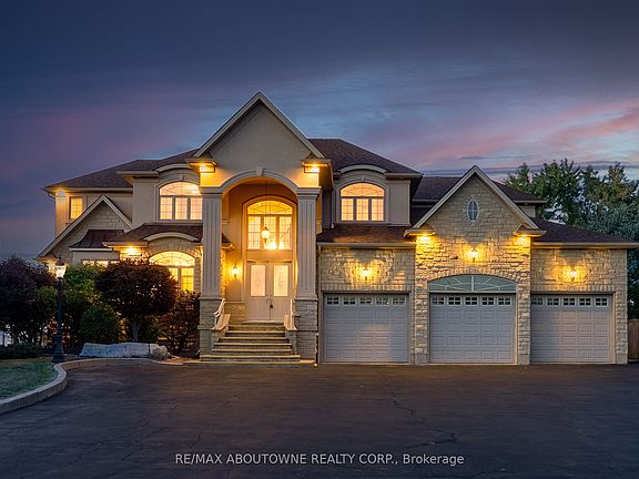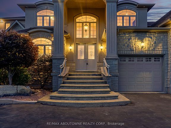 Welcome to 803 Ridge Road an extraordinary custom-built residence set on a pristine 0.81 acre lot with breathtaking vistas of Lake Ontario and the Toronto skyline. Spanning nearly 9,000 sq.ft. of finished living space, this home masterfully combines timeless craftsmanship with modern luxury.Step into the grand foyer with 19 ceilings and an elegant oak and wrought-iron staircase. The expansive living and great rooms feature multiple fireplaces, soaring ceilings, and walls of windows that flood the home with natural light. A double-sided fireplace connects the great room to the breakfast area and kitchen area. A custom gourmet kitchen is a chefs dream, appointed with Wolf and Viking appliances, built-in cabinetry, a spacious pantry, and a walk-out to the patio. A formal oversized dining room connected to the ventilated solarium ideal for a cigar lounge or private retreat and wet bar make this level perfect for entertaining. The primary suite is a true sanctuary with its own fireplace, private balcony overlooking the lake, a massive walk-in closet, and a spa-like 6-piece ensuite. Every bedroom offers its own ensuite, and two additional bedrooms enjoys a balcony with panoramic lake views. A cozy family room overlooking the front yard completes this level, providing a quiet retreat for evenings at home. The fully finished lower level was designed for both leisure and wellness. It includes two bedrooms plus full bathroom, a home theatre, a fitness room, and recreation room, a dumbwaiter for convenience and a wine cellar. Ample storage rooms make it as functional as it is luxurious. This is a rare offering a lakeview luxury estate with every amenity imaginable, minutes to Burlington, Oakville, and quick highway access.