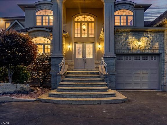 Welcome to 803 Ridge Road an extraordinary custom-built residence set on a pristine 0.81 acre lot with breathtaking vistas of Lake Ontario and the Toronto skyline. Spanning nearly 9,000 sq.ft. of finished living space, this home masterfully combines timeless craftsmanship with modern luxury.Step into the grand foyer with 19 ceilings and an elegant oak and wrought-iron staircase. The expansive living and great rooms feature multiple fireplaces, soaring ceilings, and walls of windows that flood the home with natural light. A double-sided fireplace connects the great room to the breakfast area and kitchen area. A custom gourmet kitchen is a chefs dream, appointed with Wolf and Viking appliances, built-in cabinetry, a spacious pantry, and a walk-out to the patio. A formal oversized dining room connected to the ventilated solarium ideal for a cigar lounge or private retreat and wet bar make this level perfect for entertaining. The primary suite is a true sanctuary with its own fireplace, private balcony overlooking the lake, a massive walk-in closet, and a spa-like 6-piece ensuite. Every bedroom offers its own ensuite, and two additional bedrooms enjoys a balcony with panoramic lake views. A cozy family room overlooking the front yard completes this level, providing a quiet retreat for evenings at home. The fully finished lower level was designed for both leisure and wellness. It includes two bedrooms plus full bathroom, a home theatre, a fitness room, and recreation room, a dumbwaiter for convenience and a wine cellar. Ample storage rooms make it as functional as it is luxurious. This is a rare offering a lakeview luxury estate with every amenity imaginable, minutes to Burlington, Oakville, and quick highway access.