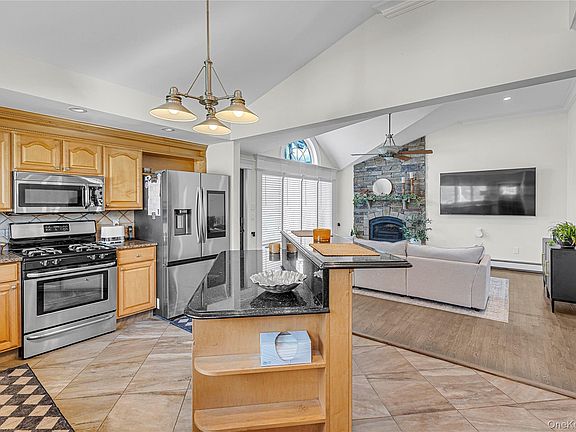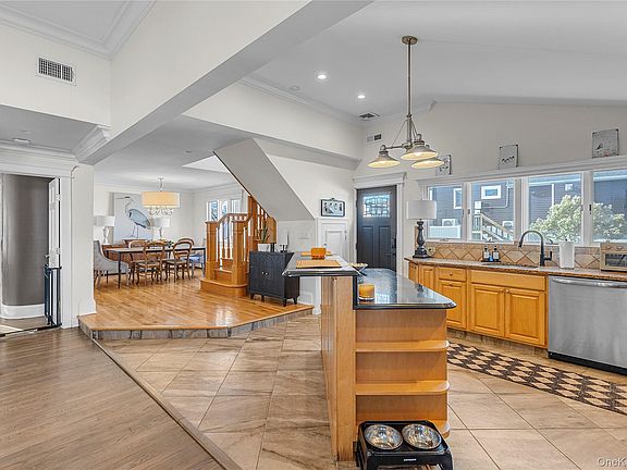 Beautiful waterfront retreat in Lindenhurst offering 100 feet of prime frontage for docking, just minutes to the bay—bring your boat! This charming 3-bedroom, 2-full-bath home features a multi-car Nicolock paver driveway with cement pillars and ambient lighting. Gleaming hardwood flooring flows throughout. The eat-in kitchen boasts granite countertops, a center island with seating, stainless steel appliances, decorative tile backsplash, vaulted ceilings, and tile flooring. The living room impresses with vaulted ceilings, a stone fireplace, and decorative windows flooding the space with natural light. A large formal dining room is perfect for entertaining. The spacious first-floor master bedroom includes a wall of closets, ornate ceiling, and sliders to the yard, complemented by an updated marble bath. Upstairs, two additional generous bedrooms offer captivating water views and ample closet space, along with an updated custom bath featuring a walk-in shower and radiant heating. A separate second-floor laundry room adds convenience, and central air ensures year-round comfort. Step out to your private waterfront yard with a large Trex deck and patio area. The property also includes a large 2-story detached structure currently zoned for storage, with potential for additional uses or living space with proper permits. Recent updates feature a new roof, Andersen windows, gas burner, hot water heater, 200-amp electrical, professional landscape design, and much more. A rare opportunity for serene coastal living!