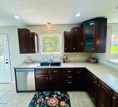- Features: Walk-Out Access, Kitchen Island, Eat-in Kitchen, Pantry, Wood Cabinets, Solid Surface Counters, Ceramic Tile Flooring, Recessed Lighting