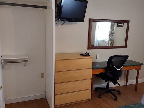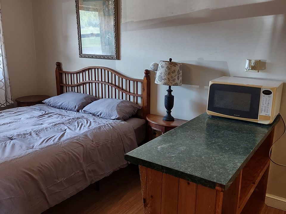 This studio unit comes with a king bed, a stove top, and microwave. Heat, electricity, water, cable and Wi-Fi are all included in the monthly rate. Pets are considered with a fee.