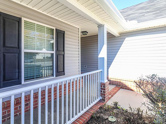 The kitchen is well-equipped with a pantry, breakfast bar, built-in microwave, smooth-top range, dishwasher, and refrigerator—all ready for your next meal. The owner's suite includes a spacious walk-in closet and a relaxing garden tub. Thoughtful touches like ceiling fans in the living room and both bedrooms, a linen closet, blinds throughout, and a covered front porch ideal for rocking chairs add comfort and convenience.