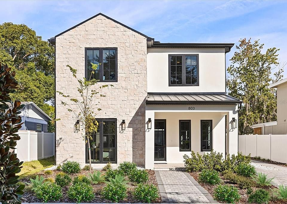 A newly constructed luxury home in the heart of College Park, this property blends modern craftsmanship with the classic charm of one of Orlando's most beloved neighborhoods. The main level unfolds with an effortless sense of openness, where the living room, dining room, and family room flow seamlessly around a chef's kitchen appointed with stone counters, a designer range hood, and a suite of built-in appliances including a wine refrigerator. A private bedroom with a full bath on this level offers ideal flexibility for guests or a dedicated workspace. The second floor is designed for comfort and privacy, beginning with a serene primary suite featuring a generous walk-in closet and a spa inspired bath.Three additional bedrooms provide abundant space for family and visitors, while a loft and an upstairs laundry room add everyday convenience to the thoughtful layout. Throughout the home, engineered hardwood and porcelain tile floors combine durability with beauty, and features such as zoned climate control, custom accents, and ample storage showcase the quality of construction. Outdoors, the lifestyle continues with a covered living area, an outdoor kitchen, and a landscaped yard ideal for quiet evenings or weekend gatherings. A long driveway leads to a rare detached garage that adds both convenience and private covered parking. Sidewalk lined streets connect you to the energy of College Park, where local dining, boutique shopping, parks, and the upcoming Packing District enrich every day. Move in ready and meticulously designed, this luxury home offers a refined way of living in a location that brings the best of Orlando to your doorstep