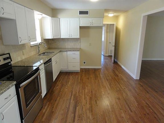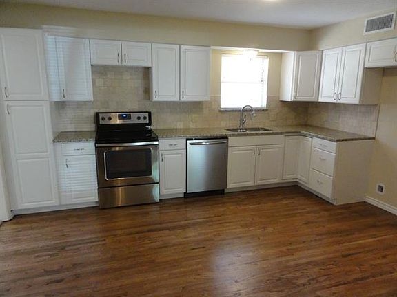 All updated and move in ready. Nailed down hand scrapped hard wood floors. Kitchen has granite, travertine backsplash, SS apps. All completely repainted inside and out. Updated bathrooms with all new c-tile. Dog run in backyard. Close to I-30 and downtown. Mature trees.