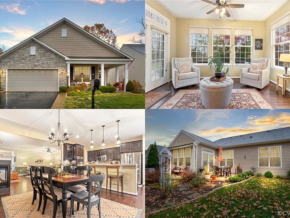 ENJOY 1-LEVEL, LOW-MAINTENANCE LIVING IN THIS 55+ ACTIVE ADULT COMMUNITY - FOUR SEASONS AT NEW KENT! Beautiful curb appeal w/established landscaping. Enter thru charming covered front porch into bright & open interior, 2,256 sqft 3bed 2ba w/tons of closet space throughout. You are going to love living here w/features: recessed lighting, built-in surround sound system, gas fireplace connected to the home's HVAC system to help keep heat up on a really frigid day, sunroom/morning room w/French doors to a private & beautiful fenced-in backyard w/stamped concrete & retractable awning. Beautiful kit w/backsplash, breakfast bar & double oven. Lovely primary ensuite w/his & her closets. 2-car garage! Community amenities include 2 clubhouses, fitness centers, gathering areas, plenty of community events, outdoor pools, pickleball courts & libraries. walking trails throughout the neighborhood provide a great way to enjoy the outdoors. Residents have access to Rees Jones-Designed golf course at Viniterra & the renowned New Kent Vineyards Winery and an adjacent café! Located near I-64 between Richmond & Williamsburg, 4 scenic rivers & Virginia Beach are just a short drive away. Come & see!
