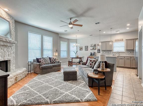 Large Sonoma Ranch 3 bedroom plus study in Helotes is move-in ready with gorgeous floors and accent colors! Stone fireplace in family room! Open, island kitchen features granite countertops & giant pantry! Granite counter tops & dual sinks in master and second bath! "Split" master with garden tub & separate shower. Big bedrooms all have roomy walk-in closets! Sprawling game room even has it's own storage! Stone exterior with stone patio in back. Automatic sprinkler system. Backs to greenbelt for privacy!