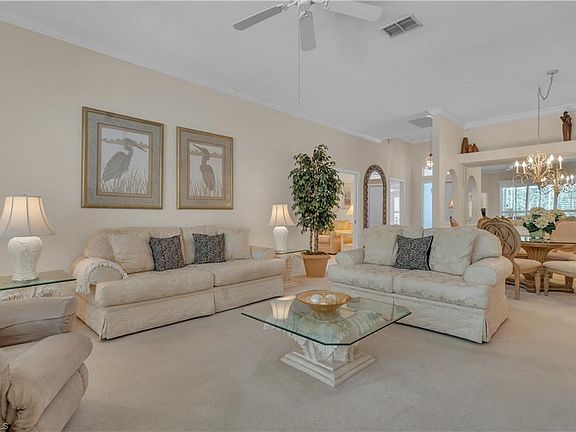 Welcome to this beautifully appointed Dover floor plan villa, ideally situated in Naples Heritage Golf and Country Club! Nestled at the end of a quiet cul-de-sac on a pie-shaped lot with desirable southern exposure, this light-filled home offers exceptional privacy and year-round sunshine. Step outside to your private oasis featuring a large pool with a sun shelf—perfect for relaxing or entertaining. The expansive lanai offers both shaded and open-air spaces, ideal for lounging or enjoying meals with family and friends around the outdoor dining area. Inside, this three-bedroom, two-bath villa has a thoughtfully designed split floor plan. The third bedroom provides flexibility to be used as a guest room, den, or home office. Elegant touches including crown molding and plantation shutters are featured throughout. The kitchen is a chef’s delight, complete with granite countertops, stainless steel appliances, and a dedicated beverage fridge. Entertaining is effortless with a formal dining area that flows seamlessly into the open living room, which connects to the lanai through sliding glass doors. Retreat to the spacious primary suite, which features a walk-in closet and a dual-sink vanity in the en-suite bath. A generous two-car garage provides ample storage. Best of all, this low-maintenance lifestyle includes landscaping, roof replacement, and more—managed by the association so you can enjoy the beauty of Naples without the hassle.This property comes with a full golf membership to Naples Heritage, a premier bundled golf community with an 18-hole, Gordon Lewis designed golf course offering golfers leagues, clinics, tournaments and more! Beyond golf, Naples Heritage also has four pickleball courts and six tennis courts with regularly scheduled leagues and clinics, bocce, a fitness center with a wide variety of classes, poolside dining at the Palm Terrace overlooking the resort style pool, additional dining at the main clubhouse, endless social events throughout season, walking trails and more. The community is conveniently located just 15 minutes from downtown Naples, near i-75 for quick access to head to the airport, and just off of Collier to head south towards Marco Island. What are you waiting for? Come get your slice of paradise today!